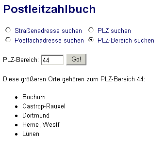 - Nach erfolgreicher Suche erhalten Sie die zu diesem PLZ-Bereich gehörenden größeren Städte angezeigt, d.h. Städte, die mindestens vier verschiedene Postleitzahlen haben.