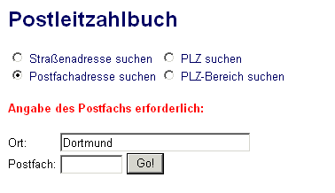 Der Radiobutton "Postfachadresse suchen" muss markiert sein.