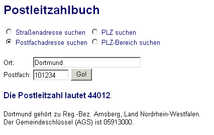 Ermöglicht das Auffinden von Postfach-Postleitzahlen für einen gewünschten Ort. Es besteht auch die Möglichkeit, sich alle Postfach-Postleitzahlen eines Ortes anzeigen zu lassen.